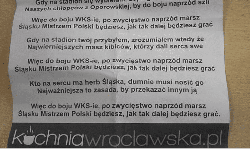 „O Wrocławiu pragnę marzyć…” to piosenka z dość patriotycznym tekstem, na swój sposób piękna i liryczna, ale nie do końca pasująca do stadionowej energii. Oto tekst: