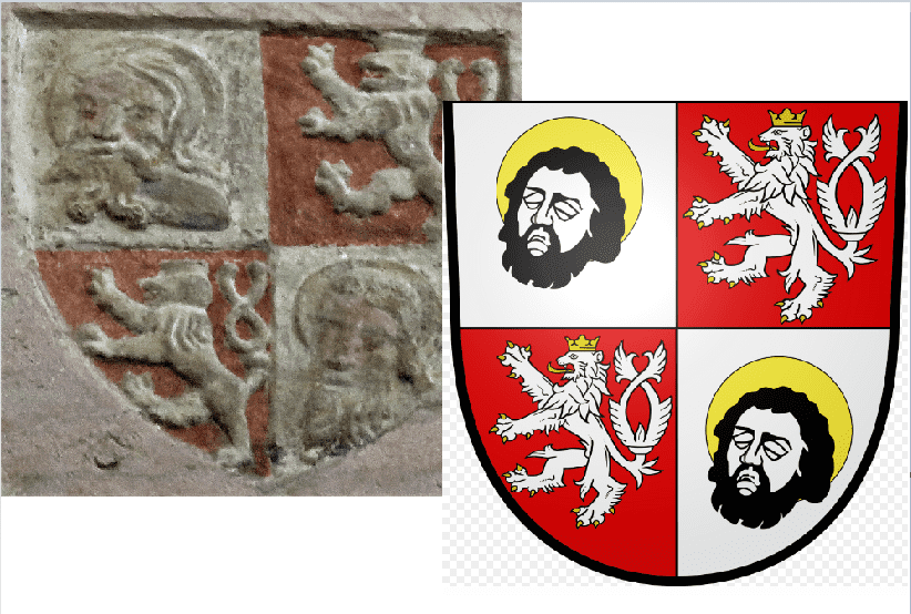 Prawy górny róg przedstawia lwa z koroną, który ma czeskie pochodzenie i wskazuje na przynależność do dawnej korony królestwa czeskiego.