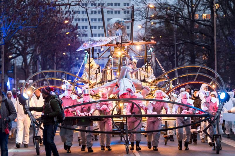 Чотири процесії зустрілися в центрі, де за кілька хвилин металеві конструкції, які вони несли, перетворилися на одну гігантську інсталяцію. Враження від побаченого глядачами посилювали світлові візуальні ефекти на розташованих поруч багатоквартирних будинках, і це була лише частина грандіозного шоу. У фіналі з вежі ратуші спустилися ангели – переодягнені актори, а з вікон будинків пролунала жива музика – грали представники військових духових оркестрів.